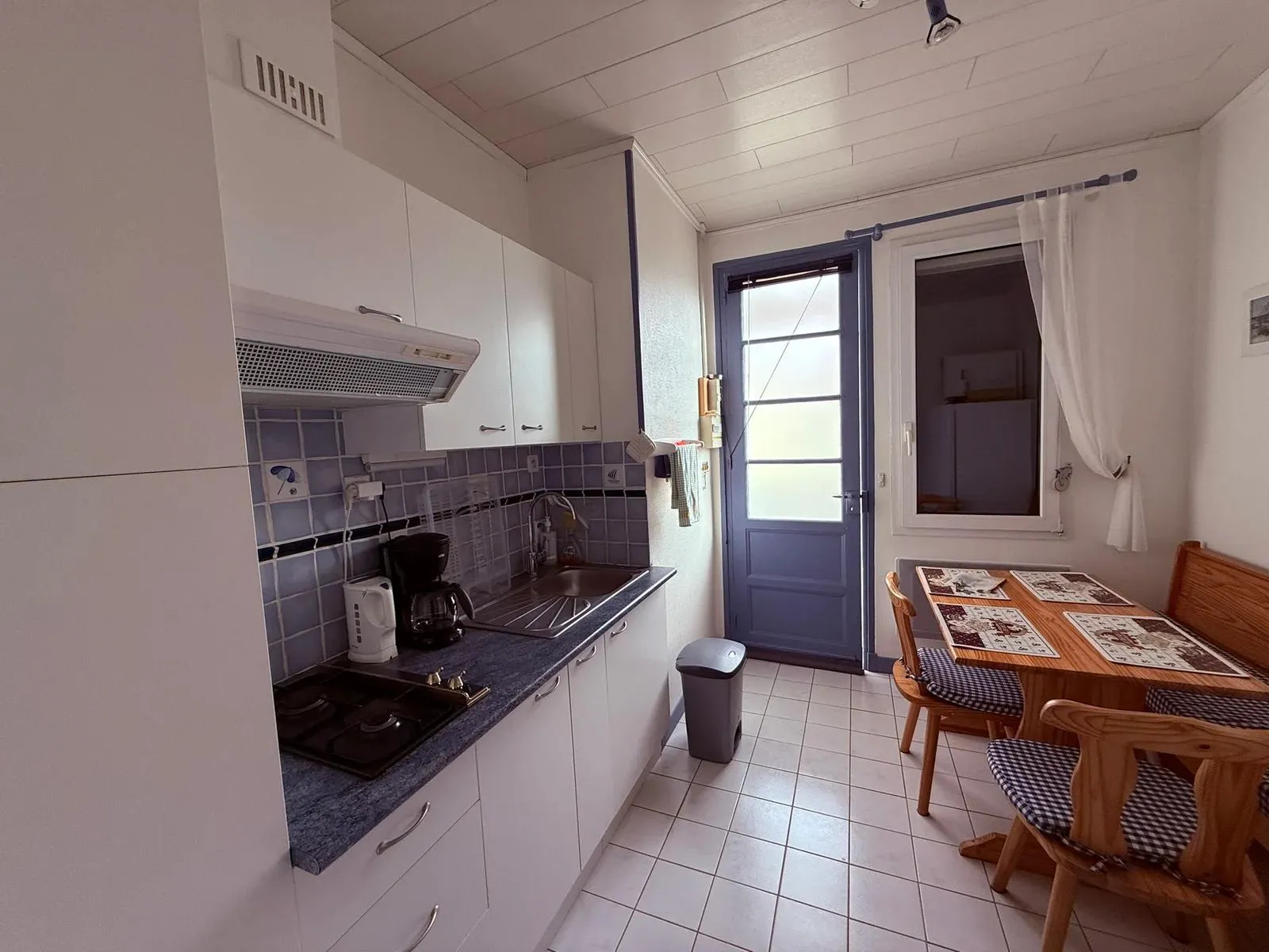 Cuisine tout équipée : Plaques de cuisson, four/micro-ondes, réfrigérateur, lave-vaisselle et petit électroménager complet (bouilloire, cafetière, grille-pain).